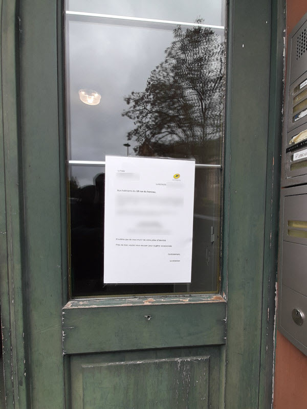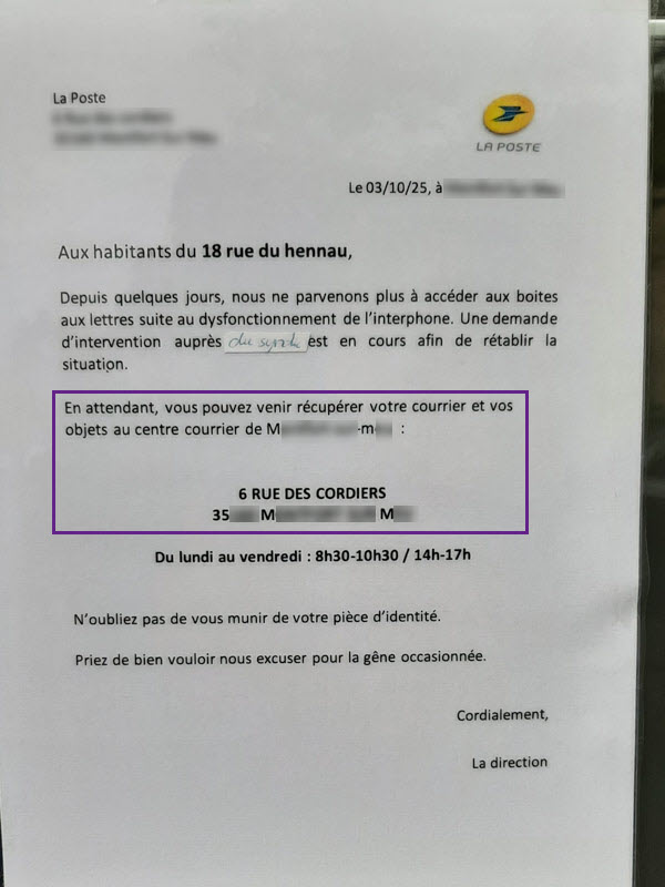 L’absurdité de la situation évoquée ci-dessous saute aux yeux des habitants qui constatent que l’immeuble impacté par le problème de dysfonctionnement de l’interphone se trouve précisément dans la rue de la poste, à peine à une minute à pied. Mais que ses habitants devront faire 40 minutes à pied pour aller récupérer leur courrier (ou 10 minutes en voiture, ce qui est bien plus « écolo »).