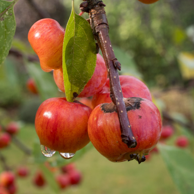 Petites pommes de mon pommier ‘Evereste’, dégouttantes de pluie. Elles ne sont pas dégoûtantes pour autant !