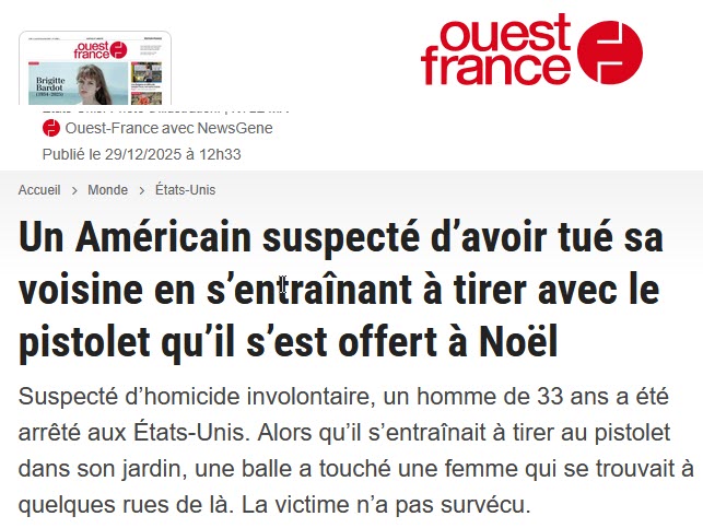 Le 24 décembre 2025, papi Jo s’était insurgé contre la stupide coutume américaine de s’offrir des armes à feu comme cadeaux de Noël. Aujourd’hui 29 décembre, les cadeaux ont été déballés, admirés … et voici le résultat (attendu).