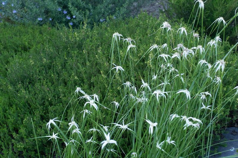 Nom commun : rhynchospore coloré, danseuse étoileFamille : CyperaceaeType : GraminéePort : DresséHauteur : 50 cm-1 mètreLargeur : 10-50 cmCouleur floraison : Blanc& Blanc-crèmeFloraison de : Juilletà OctobreFeuillage : CaducCouleur feuillage : VertRusticité: Rustique jusqu'à -15° / -10°Exposition : SoleilHumidité : Humide mais drainéSaison d'intérêt : Été - AutomnePlante de climat chaud, proche cousine du Papyrus, elle nécessite beaucoup d’humidité pour pousser et fleurir convenablement. Dès le milieu de l’été, apparaissent une multitude d’inflorescences composées de trois bractées blanches en forme d’étoiles. Haute de 60cm , elle forme une souche cespiteuse (qui reste en touffe) et donc ne s’étend guère. Vivace, mais rustique jusqu’à -6C°, elle trouvera sa place, dans les jardins aux hivers doux, sur les berges d’un bassin ou dans un massif humide, formant une cuvette. Ailleurs, elle sera cultivée en pot, au soleil ou à mi-ombre mais toujours avec une réserve d’eau suffisante à sa bonne croissance. Une petite soucoupe installée sous le pot lui suffira largement. [Promesse de fleurs]