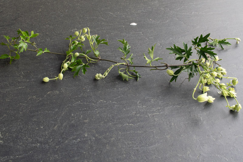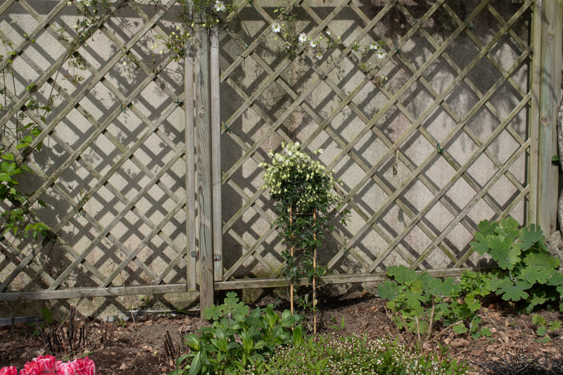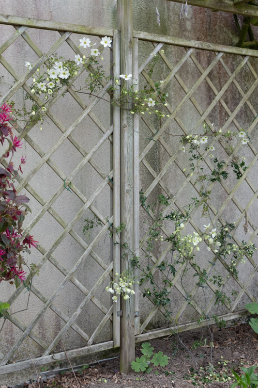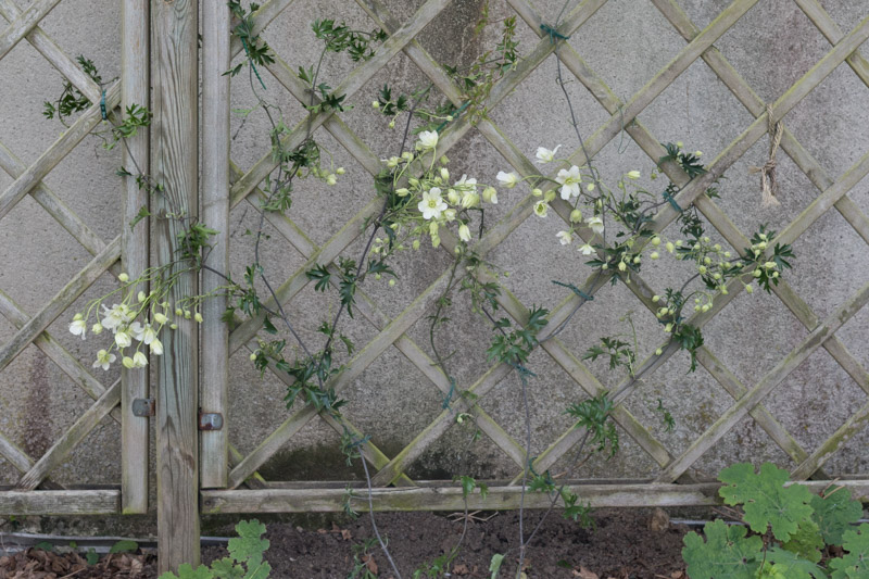 Le spécimen acheté (sur le marché du Vendredi de ma commune) nous faisait de l’œil, et on n’a pas pu résister. Évidemment, les tiges tressées bien serrées sur une petite « échelle » en bambou mettaient bien en valeur les nombreuses clochettes blanc crème. Mais ce dispositif a bien compliqué la tâche du jardinier, au moment de la plantation en terre. Il a fallu s’armer de patience pour désentortiller les tiges de leur support, afin de retirer celui-ci et d’attacher les tiges ainsi libérées sur le treillis. Fort heureusement les tiges de cette espèce sont nettement plus souples que celles d’autres clématites, et l’opération s’est bien déroulé, au prix d’une douzaine de fleurs ou de boutons et d’un bout de tige, cassé net. Pour l’instant cette C. ‘Avalanche’ complète parfaitement, en partie basse du treillis,; la C. ‘Early Sensation’ en partie haute. Espérons qu’elle va se plaire et prospérer, pour masquer le vilain mur gris à l’arrière.
