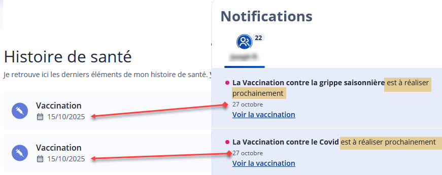 Tout récemment je reçois un mail de Mon Espace Santé m’informant que je dois me faire vacciner « prochainement ». Intrigué, je clique comme on m’y invite pour aller sur Mon Espace Santé. C’est vraiment très bien fait, cet espace Santé, tout est bien à jour. J’y vois dans mon Histoire de santé que j’ai été vacciné contre la grippe et le/la ? COVID le 15 octobre. Mais alors, pourquoi m’inviter à me faire vacciner puisque c’est déjà fait ? J’ai une explication, tellement évidente qu’elle a dû échapper aux informaticiens chevronnés qui ont programmé cet Espace Santé : ils ont oublié de mettre un lien automatique entre l’historique des vaccinations effectuées (à gauche sur l’image) et les notifications (à droite) pour les désactiver/supprimer dès que les vaccinations sont faites. CQFD.