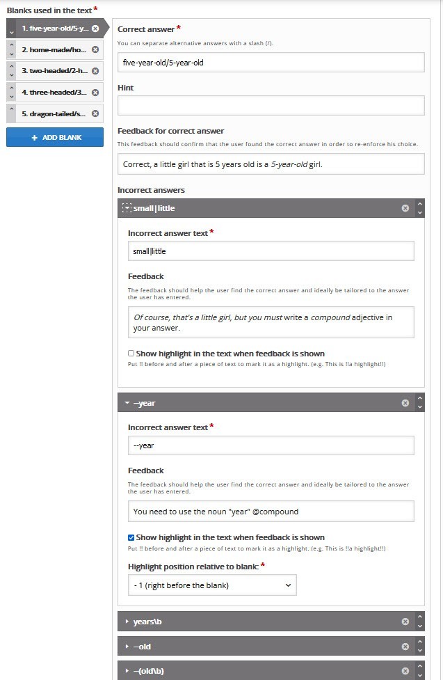 Now we should define all the possible correct alternatives as well as the potential incorrect ones. This is done in the “Blanks used in the text” section.