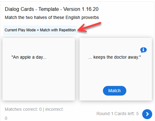 Supposing the student selects the Match with repetition mode, a notice with that Mode’s name will be displayed when he does the activity: