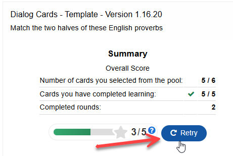 Once the current activity is finished (here on the final Summary screen), a click on the Retry button will take the student to the very first screen where they can select a new Play Mode…