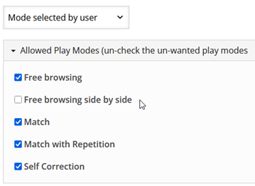 In this example, the student will be offered a choice of the 4 selected Play Modes, but the un-selected Free browsing side by side choice won’t be displayed. By default all 5 modes are selected.