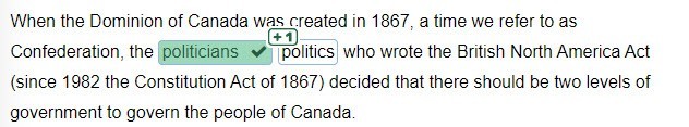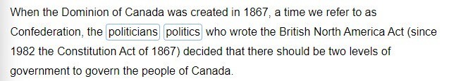 When the Dominion of Canada was created in 1867, a time we refer to as Confederation, the *politicians* / _politics_ who wrote the British North America Act (since 1982 the Constitution Act of 1867) decided that there should be two levels of government to govern the people of Canada.