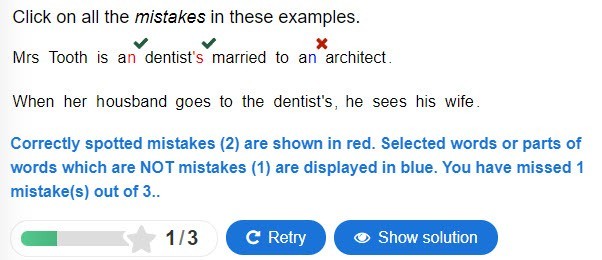 - Spot the Mistakes mode: instead of marking the correct words, the student must mark the incorrect ones (spelling mistakes, wrong grammar forms). This mode makes it possible to display mock Multiple Choice questions within the activity text. Incorrect choices aka distractors must be specified by the teacher when creating the activity.
